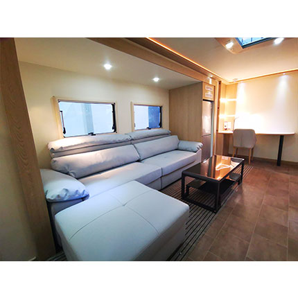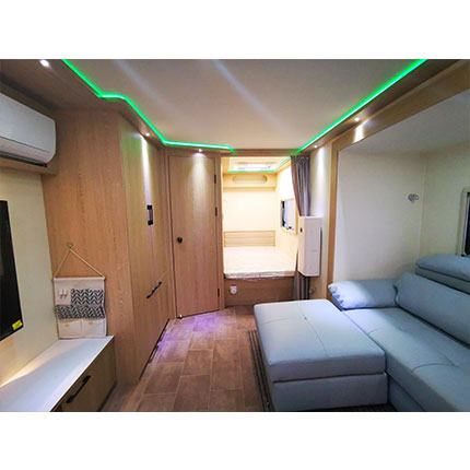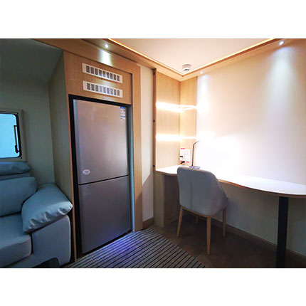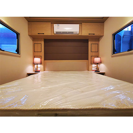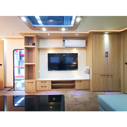 該款營(yíng)地房車(chē),外觀美式風(fēng)格,內(nèi)飾采用簡(jiǎn)歐風(fēng)格、結(jié)合國(guó)內(nèi)的用戶需求,布局分為三大部分,前部分為休息區(qū)豪華雙人床版,中部為會(huì)客區(qū),帶KTV功能可隨時(shí)唱享,后部分為單人床休息區(qū),干濕分離衛(wèi)生間,智能座便器等,家具采用環(huán)保輕質(zhì)進(jìn)口板材,用電設(shè)施齊全,營(yíng)造舒適的入住環(huán)境。